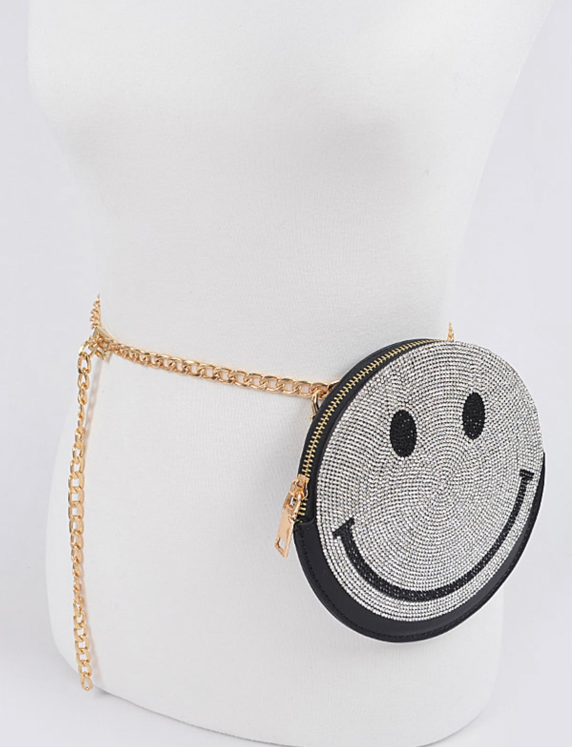 HAPPY FACE PURSE - CARTERA ESTILO CORREA CON DISEÑDE CARA FELIZ EN RHINESTONES