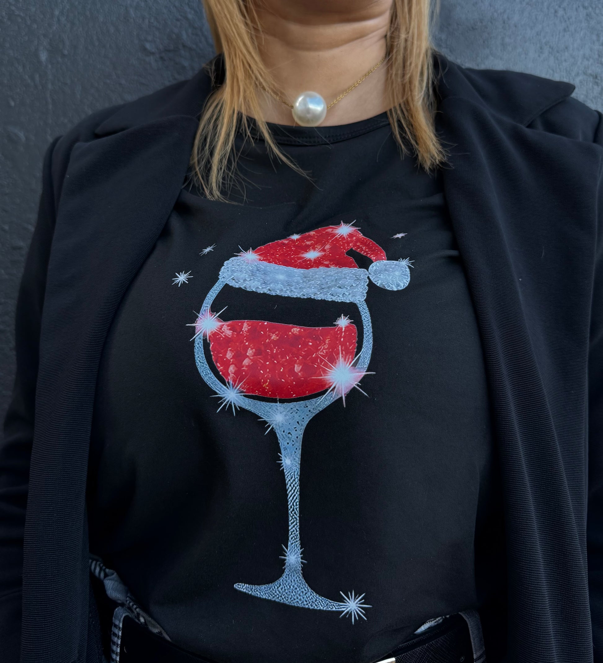 La Santa Wine Tee – Holiday Edition es la camisa ideal para entrar en mood navideño con estilo, humor y un toque elegante. Su diseño de copa navideña con gorrito de Santa combina brillo, rojo festivo y detalles que destacan en cualquier ocasión.